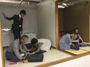 午前中はショールーム見学、午後からは、北区防災センターでの地震、煙体験をしてきました。